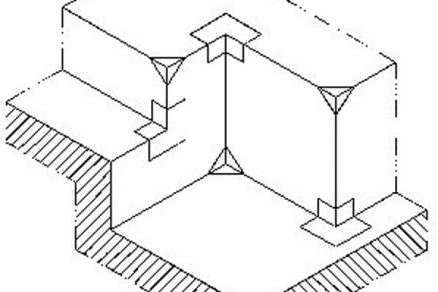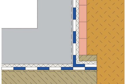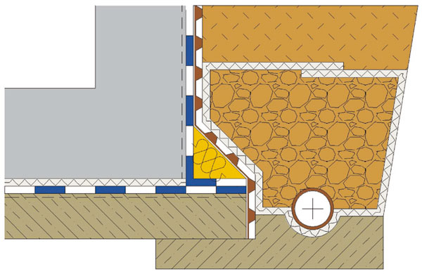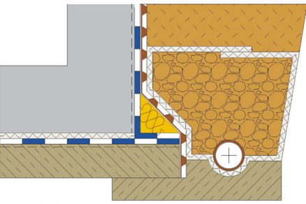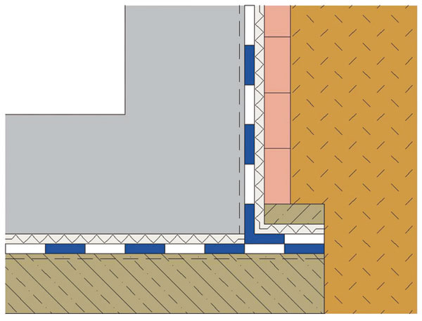 | Príklad prechodu hydroizolačného systému z vodorovnej na zvislú konštrukciu bez drenážneho systému | Príklad prechodu hydroizolačného systému z vodorovnej na zvislú konštrukciu s drenážnym systémom |