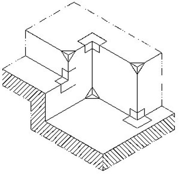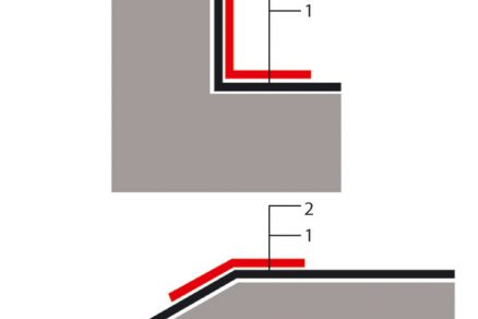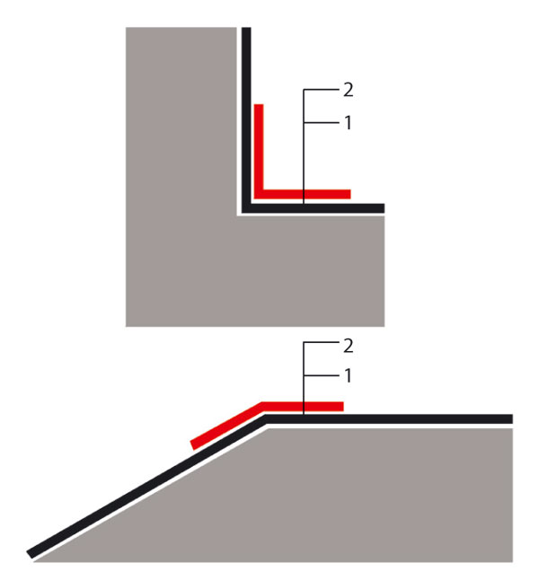 | Zosilnenie kútov a hrán 1 – hydroizolačný povlak, 2 – zosilňujúci pás hydroizolácie |