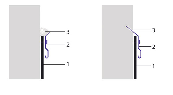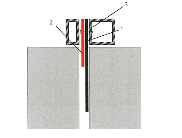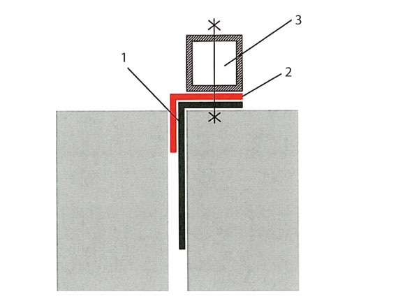| Ukončenie hydroizolácie na výkladcoch 1 – hydroizolačný povlak, 2 – zosilňujúci pás hydroizolácie, 3 – rám dverí alebo výkladca |