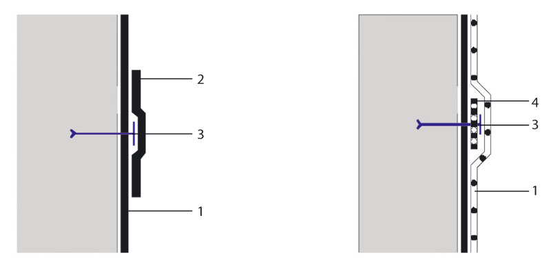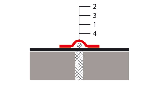 1 – hydroizolačný povlak, 2 – zosilňujúci pás hydroizolácie, 3 – prvok mechanického kotvenia, 4 – podkladový pásik z fóliového plechu alebo plastu
