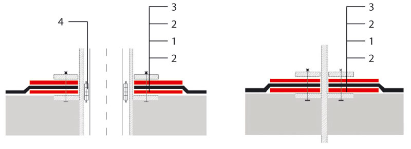 1 – hydroizolačný povlak, 2 – zosilňujúci pás hydroizolácie, 3 – voľná príruba, 4 – rozperný tesniaci prvok