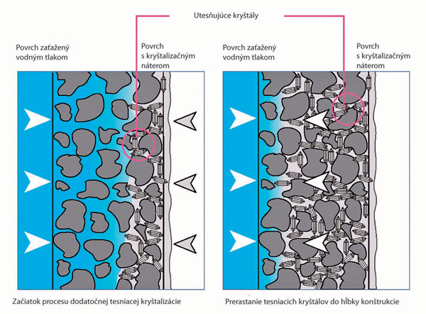 Základným produktom špeciálnej chemickej reakcie vyvolanej kryštalizačnou látkou v štruktúre betónu je teda dodatočne narastený kryštál vypĺňajúci kapilárny pór. Kryštál po aplikácii kryštalizačnej látky vyrastá v kapilárnych póroch obsahujúcich vodu, pričom túto vodu spotrebuje v priebehu vlastnej reakcie (počas vlastného rastu).