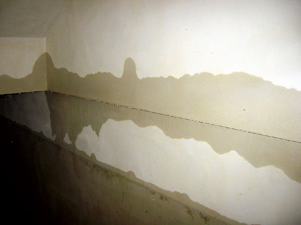 | Základný vizuálny prejav porúch zemnou vlhkosťou, vzlínajúcou vlhkosťou alebo tiež netesným zariadením TZB | Základný vizuálny prejav porúch tlakovou alebo gravitačnou vodou |