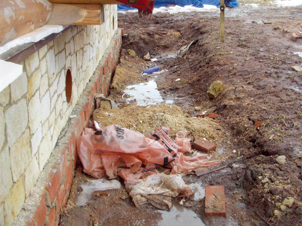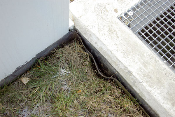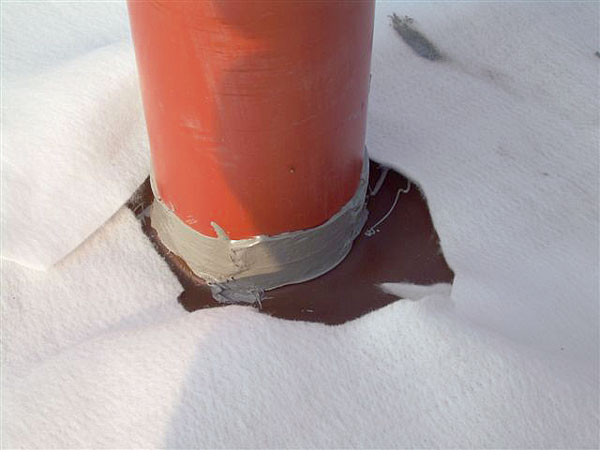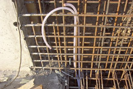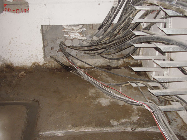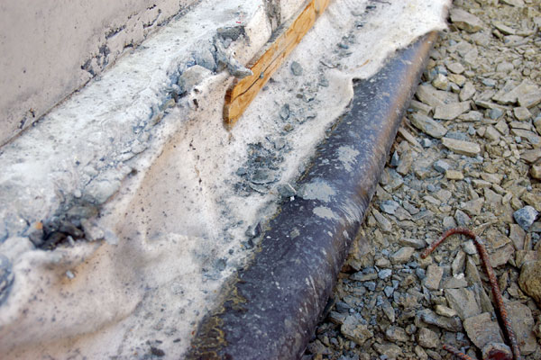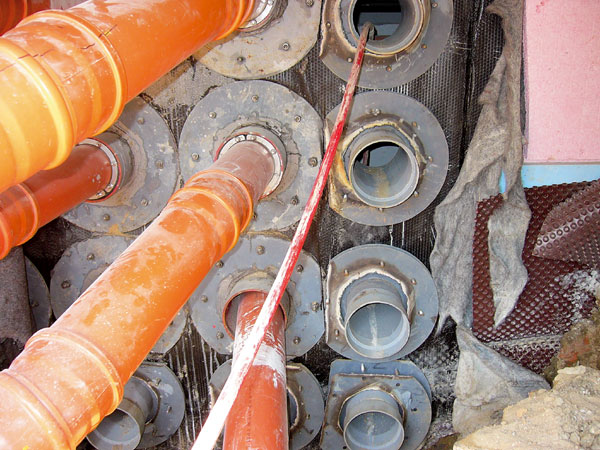 | Prestupy v hydroizolácii určené proti gravitačnej vode, pričom rúrky sú iba otmelené. Toto riešenie je mimoriadne naivné a následky môžu byť veľmi fatálne. | |