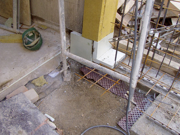 | Lešenie stojace na hydroizolačnom povlaku | Vodotesná izolácia je dotiahnutá iba k výstuži a tam je ukončená, bez akéhokoľvek korektného dohotovenia hydroizolačného systému. |