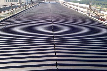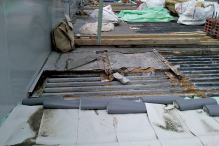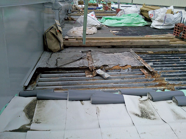 | Obr. 4 VSŽ plech po nanesení antikorózneho náteru a elastomérbitúmenovej izolácie Plastene s hrúbkou 2,0 mm | Obr. 5 Technologický postup realizácie – rozoberanie pôvodného strešného plášťa, sanácia trapézových plechov, zhotovenie vrstiev nového strešného plášťa |
