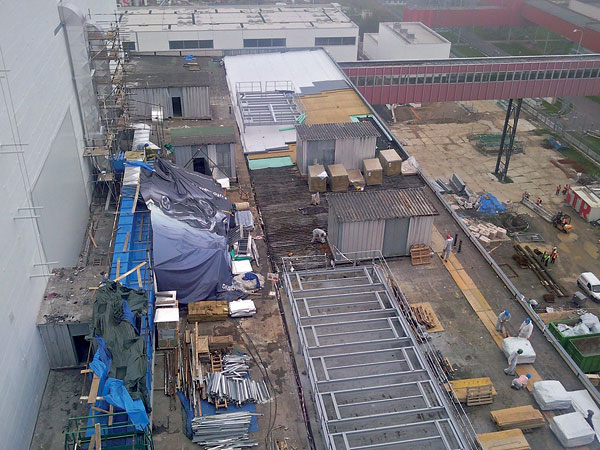 Keďže projektant bol pri návrhu rekonštrukcie strešného plášťa limitovaný uvedenými faktormi, ale najmä nemožnosťou dodatočného statického zaťaženia existujúcej strešnej konštrukcie novými strešnými vrstvami, ako jeden z možných spôsobov rekonštrukcie plášťa navrhol odstránenie pôvodných vrstiev až na vrstvu trapézového VSŽ plechu, následnú sanáciu oceľových konštrukcií a trapézových plechov a vytvorenie nového strešného plášťa (s potrebným spádovaním, tepelnoizolačnou účinnosťou, hydroizolačnou schopnosťou a v prvom rade požadovanou požiarnou odolnosťou) ukotveného k podkladu teleskopickými kotvami.