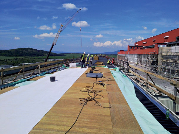 - vytvorenie novej tepelnoizolačnej vrstvy (obr. 5) – skladaný dvojvrstvový tepelnoizolačný systém z dosiek Nobasil-Thermotoid s celkovou hrúbkou 130 mm s vystriedaním styčných škár spojov (vzhľadom na požiadavku zvýšenej požiarnej odolnosti strešnej konštrukcie bola použitá minerálna vlna s objemovou hmotnosťou 200 kg/m3 a vystriedanie styčných škár spojov);