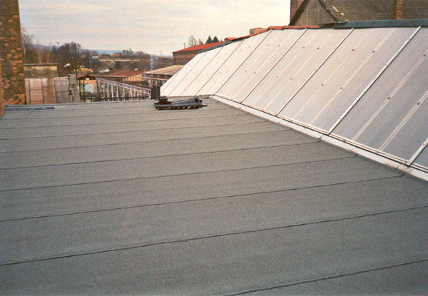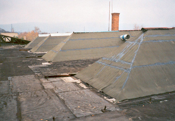 | Strecha výrobnej haly pred a po sanácii modifikovanými asfaltovými pásmi | |