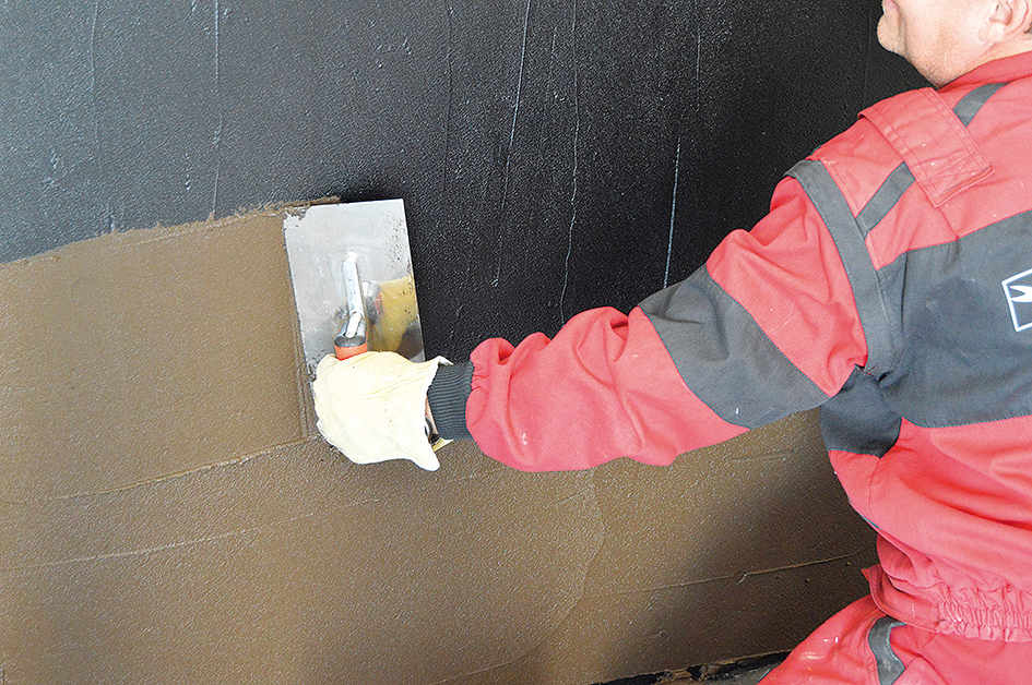 Na zaschnutú penetráciu sa nanesie celoplošne prvá hydroizolačná vrstva (použitím lepidla na polystyrén) v hrúbke minimálne 1 mm. Hrúbka nanášanej vrstvy sa kontroluje množstvom spotrebovaného materiálu.