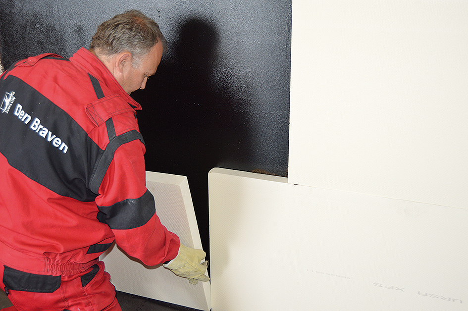 Nalepené tepelnoizolačné dosky sa dostatočne pritlačia a skoriguje sa ich poloha. Rovinnosť uložených dosiek sa zistí vodováhou. Priestor medzi polystyrénom a stenou sa nesmie tesne uzatvoriť.