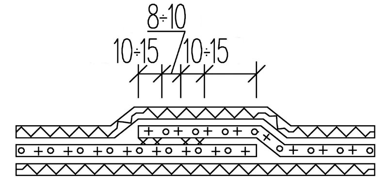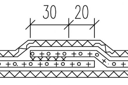 Obr.: Geometria jednoduchého spoja. Hydroizolačná fólia sa v spodnej stavbe s tlakovou vodou odporúča zvárať dvojstopovými zvarmi so skúšobným kanálikov širokým asi 10 mm. Pri dvojstopových zvaroch realizovaných strojovo sa minimálna šírka homogénneho spoja znižuje na 10 mm.