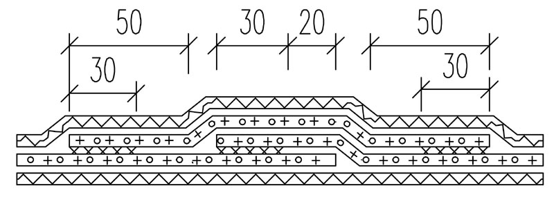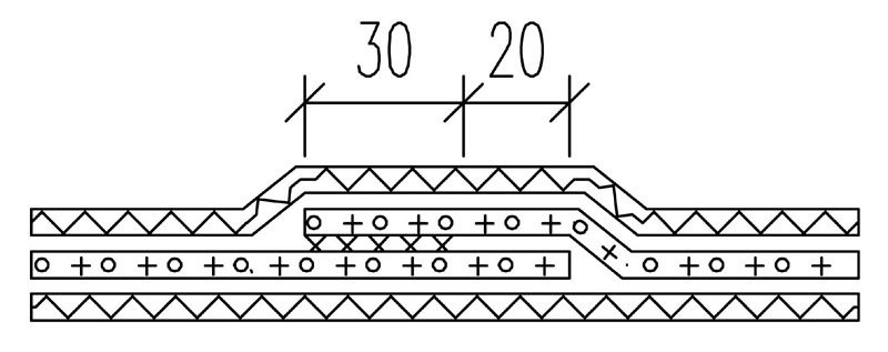 Obr.: Geometria spoja s kanálikom. V miestach, kde sa pre nedostupnosť dvojstopový zvar nedá vykonať strojovo, odporúča sa jednoduchý zvar realizovaný ručne preplátovať tak, aby sa vytvoril skúšobný kanálik.