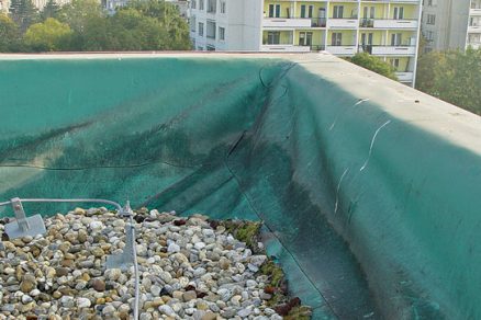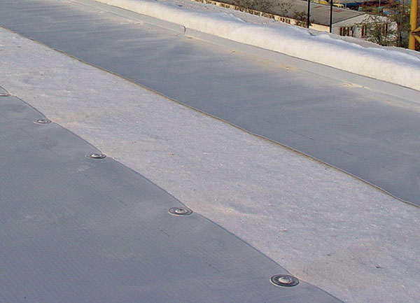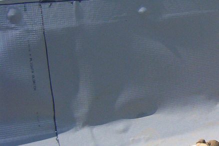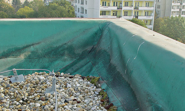 | Obr. 3 Následky nesprávne aplikovanej homogénnej fólie, ktorá sa nezabezpečila proti vnútorným silám | Obr. 5 Mechanicky kotvená heterogénna mPVC fólia |