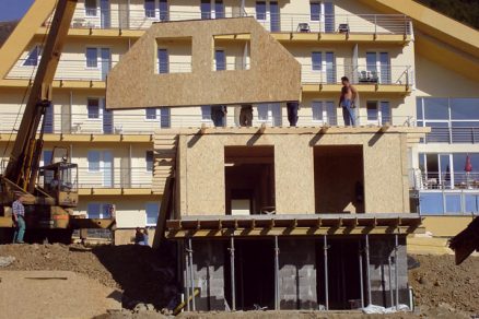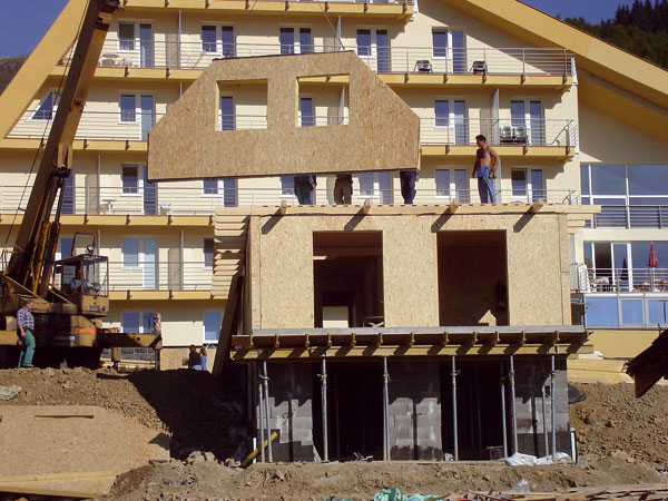 | Vonkajšia povrchová úprava sa pri panelových konštrukciách zvyčajne aplikuje až po skompletizovaní stavby. | Príklad panelovej stavby vytvorenej z celostenových panelov |
