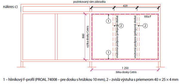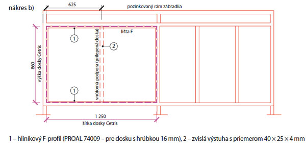F-profilu, ktorý je k rámu ukotvený nitmi. K vnútornej zvislej výstuhe je doska prilepená lepidlom na báze MS polymérov. Z obidvoch pohľadových strán nie je viditeľný žiaden kotviaci prvok. Požiadavke na mäkký ráz vyhovuje cementotriesková doska s hrúbkou 16 mm, zabezpečená vnútornou výstuhou s osovou vzdialenosťou 625 mm (nákres b) a doska s hrúbkou 10 mm, prilepená na plochu vnútornými výstuhami s osovou vzdialenosťou 420 mm (nákres c).