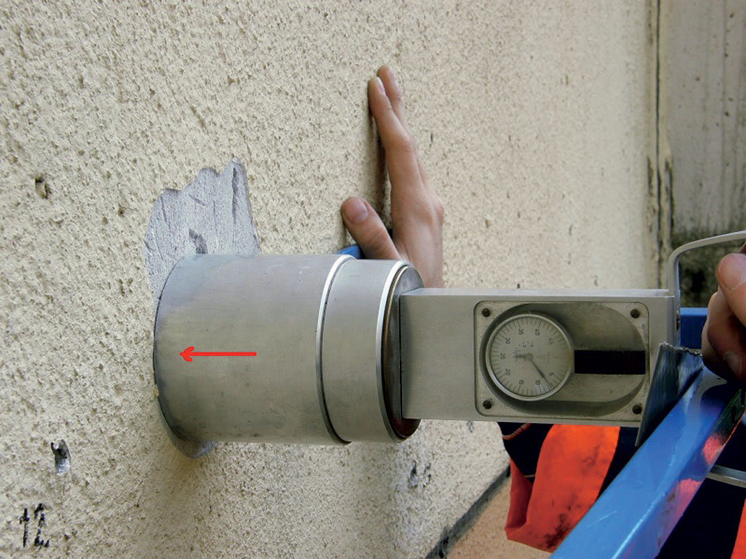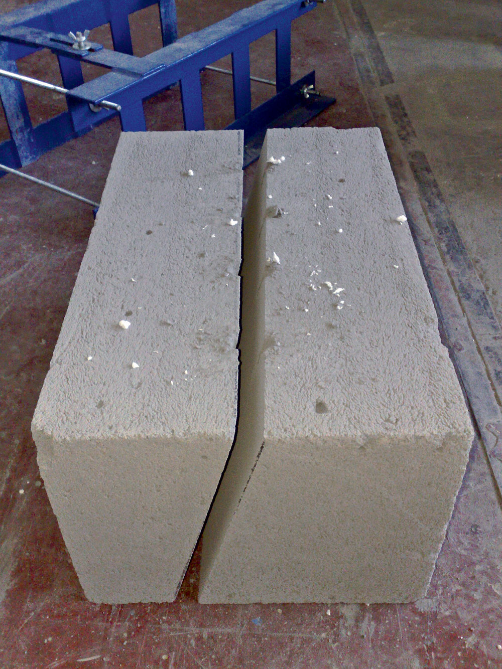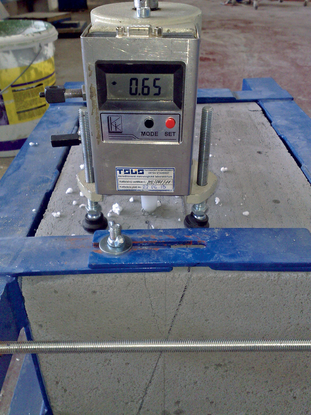 Veľkosť skúšobných telies bola 500 × 300 × 250 mm. Na jednom skúšobnom telese sa dali vykonať maximálne štyri výťažné skúšky. Pri výbere murovacích tvárnic (skúšobných telies) sa zvolila pevnostná trieda P2 s objemovou hmotnosťou 420 kg/m3, čo zodpovedá priemernej pevnosti v tlaku obvodového plášťa na báze pórobetónu, zistenej in situ (obr. 5).