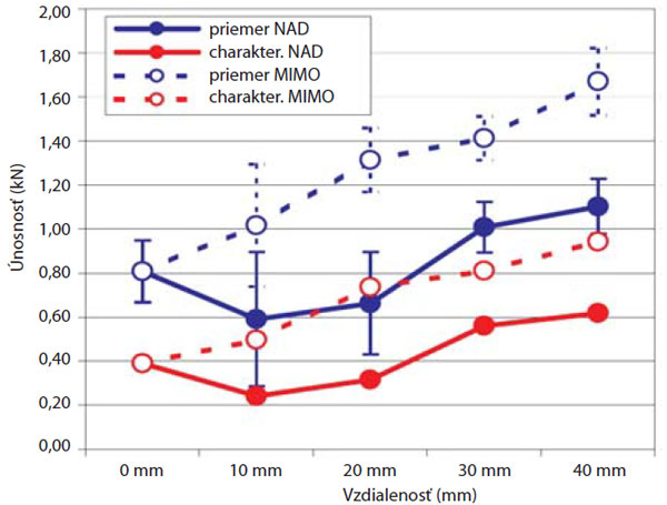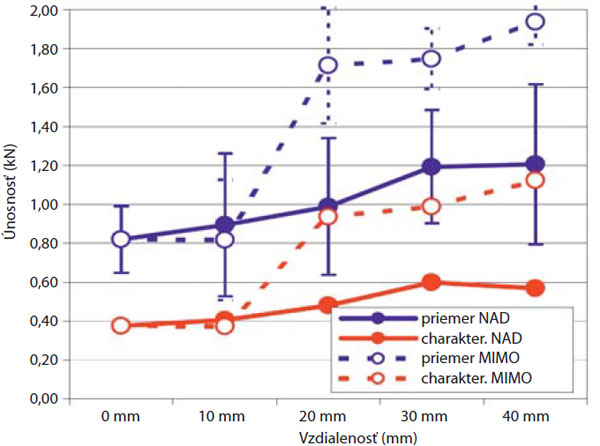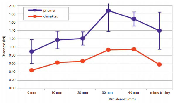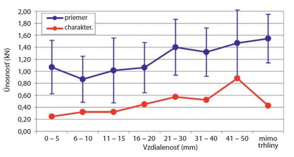 S ohľadom na nepravidelný smer reálnych trhlín v obvodovom plášti na báze pórobetónu a sťažené podmienky technických prehliadok in situ, ako aj presnosť merania dĺžok sa zvolili intervaly vzdialenosti rozperných kotiev od trhliny. Z obr. 2 jasne vyplýva lineárna závislosť priemernej únosnosti a vzdialenosti kotiev od trhliny. Vysokú variabilitu výsledkov (26,2 až 53,3 %) možno vysvetliť rôznorodosťou hmoty pórobetónu v obvodovom plášti, rôznym vekom a technológiou výroby obvodového plášťa, ale aj neidentifikovaným sklonom (pokračovaním) trhliny smerom dovnútra plášťa. Na obr. 2 sú zachytené priemerné a charakteristické únosnosti. Charakteristické únosnosti sa v zmysle ETAG 014 stanovili ako 0,6-násobok priemeru piatich najnižších meraní.