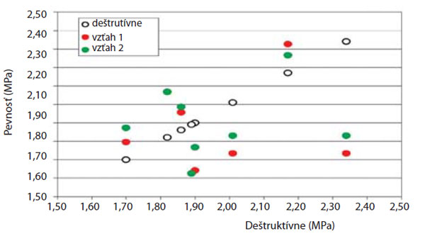 Obr. 3 Zhoda medzi nedeštruktívnymi a deštruktívnym stanovením pevnosti v tlaku