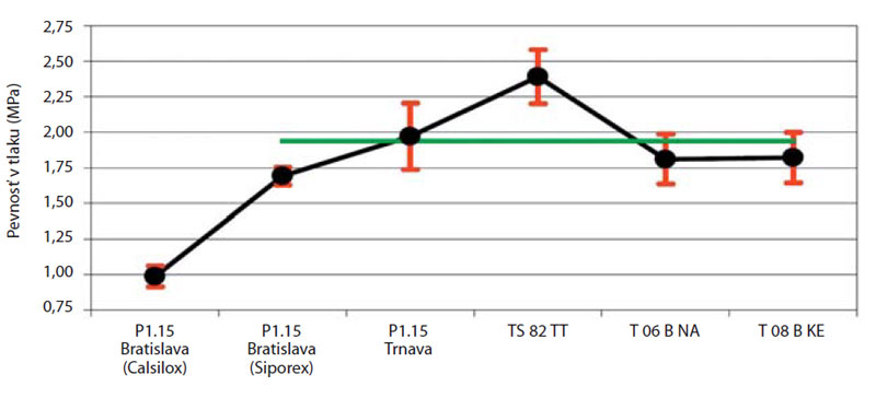 Pevnosti v tlaku obvodového plášťa vidieť na obr. 5. Na obrázku sa rozlišujú nielen bytové domy sústavy P1.15, ale aj materiálové bázy pórobetónu Calsilox a Siporex, zistené v jednom paneli bytového domu v Bratislave.