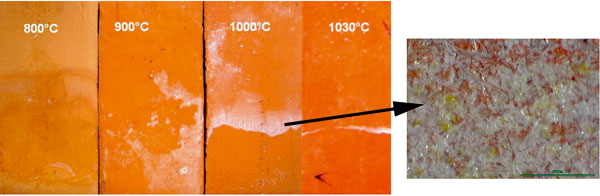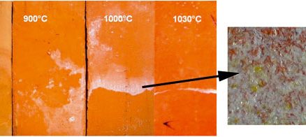 Obr. 3: Vplyv teploty vypaľovania na náchylnosť črepu tvoriť výkvety a detail výkvetu (optický mikroskop 200x)