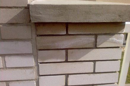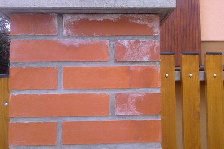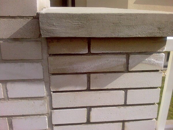 | Obr. 4 Výkvety vzniknuté vyplavením hydroxidu vápenatého z ochrannej betónovej striešky a) pri lícovom murive z pálených murovacích materiálov, b) pri lícovom murive z vápenno-pieskových tehál |