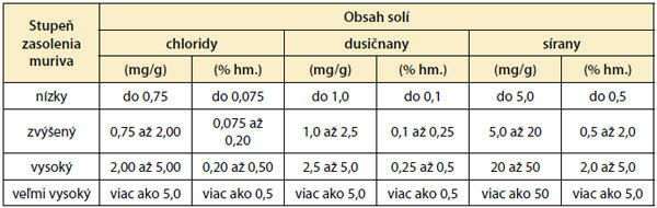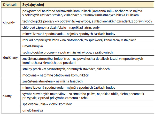 V murive sa bežne stanovujú tri anióny, ktorých soli sú najčastejšou príčinou deštrukcie muriva a omietok – sírany, chloridy a dusičnany (tab. 2).