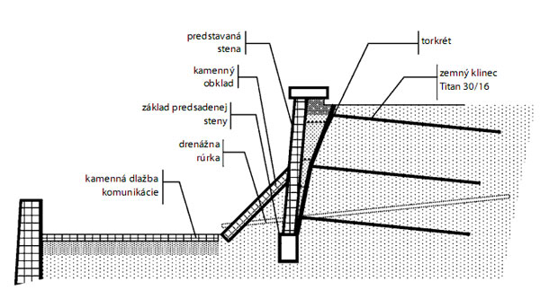 Sanácia oporného múra jeho nahradením gravitačným oporným múrom s kamenným obkladom neprichádzala do úvahy, a to pre nepriaznivé účinky ďalšieho zaťaženia svahu a oporného múra pod ním. Hľadalo sa riešenie, pri ktorom by sa nepriaznivý účinok ďalšieho zaťaženia eliminoval. So zreteľom na neprítomnosť hladiny podzemnej vody sa zvolila metóda klincovaného svahu s následným predstavením tenkej steny z pôvodného kamenného materiálu (obr. 3). Projekt sanácie oporného múra spracovala spoločnosť BESTIN, spol. s r. o., Košice.
