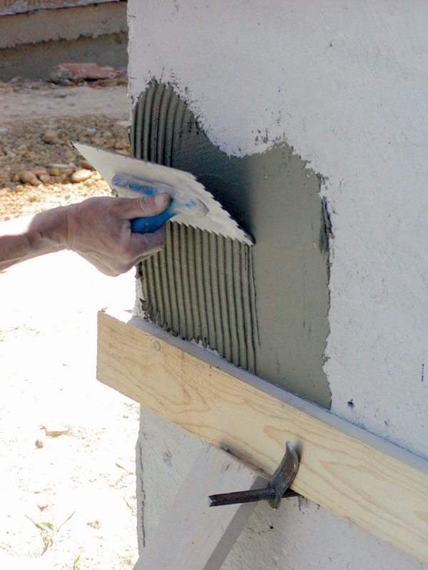 Vyznačí sa spodná hrana prvého radu. Pozdĺž nej sa pripevní drevená lata, ako pomôcka na lepenie. Následne sa pomocou hrebeňovej stierky nanesie lapiaca malta. Mala by mať skôr hustejšiu konzistenciu, aby už napelené pásiky neskĺzali po podklade. Povrch musí byť v čase lepenia pásikov lepivý, nesmie byť zavädnutý.