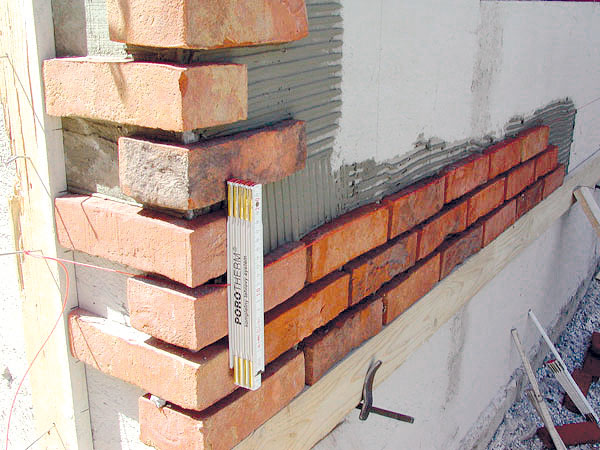 Na lepenie tehlových obkladových pásikov možno použiť akúkoľvek lepiacu maltu určenú na keramický obklad a vhodnú na použitie v exteriéri. Takáto malta by mala byť mrazuvzdorná, bez možnosti tvorby výkvetov a dostatočne flexibilná. Pri lepení pásikov v interiéri však nemusí byť ani mrazuvzdorná, ani flexibilná. Konzistencia lepiacej malty má byť optimálna, skôr hustá, aby nedochádzalo k skĺznutiu už osadených obkladových pásikov. Pásiky sa odporúča lepiť až po vyznačení spodnej hrany prvého radu (nemusí to byť a spravidla to ani nie je najspodnejší rad). Má to byť vodorovná kontrolná čiara, od ktorej sa budú odvíjať všetky ostatné rady. Pozdĺž tejto čiary sa pripevní na stenu rovná doska – ako pomôcka na lepenie prvého radu pásikov. Ostatné rady sa lepia podľa prvého radu. Lepiaca malta sa nanáša rovnomerne pomocou hrebeňovej stierky. Veľkosť plochy, na ktorú sa nanáša lepiaca malta v jednom zábere, sa volí podľa poveternostných podmienok tak, aby malta nevysychala. Z rovnakého dôvodu, ak je to možné, sa odporúča lepiť tú časť fasády, ktorá je v tieni. Ako prvé sa lepia rohové pásiky podľa rozmeriavacej laty, ktorá sa pripevní na stenu blízko rohu, aby neprekážala pri lepení. Jednotlivé rady sa môžu po nalepení urovnať do roviny pomocou hliníkovej laty alebo vodováhy. Vo všetkých detailoch okolo rohov sa odporúča použiť rohové pásiky.
