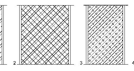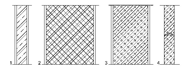 1 – železobetónová priečka obojstranne omietnutá, 2 – tehlová stena obojstranne omietnutá, 3 – pórobetónové panely alebo stena omietnutá, 4 – pórobetónové tvárnice omietnuté