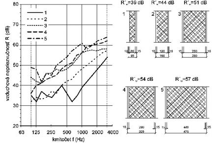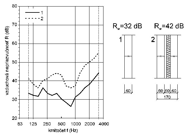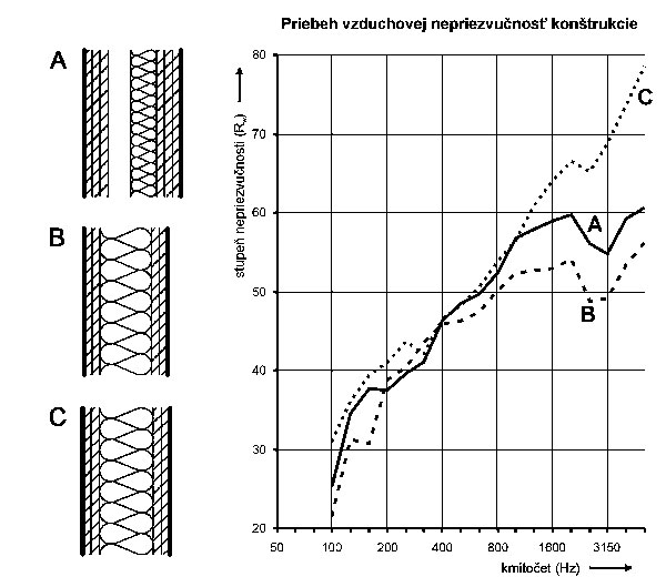 • vzduchová vrstva úplne alebo čiastočne vyplnená zvukovopohltivým materiálom (zníženie negatívneho vplyvu stojatých vĺn na Rw steny),