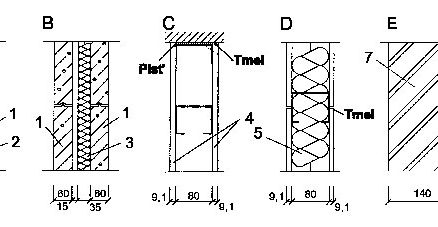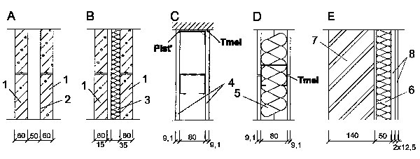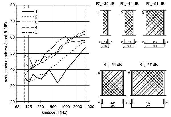 A – hmotné pórobetónové čiastkové steny  Rw = 40,0 dB, B – pórobetónové čiastkové steny so zvukovopohltivou vrstvou Rw = 44,0 dB, C – ľahké čiastkové doskové prvky so vzduchovou vrstvou Rw = 41,0 dB, D – doskové prvky so zvukovopohltivou vrstvou Rw = 49,0 dB, E – akusticky kombinovaná stena – tehlové murivo s predstenou Rw = 56,0 dB