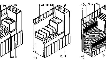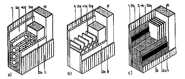 1 – plášť, 2a – drevotriesková doska, 2b – preglejka, 3 – fólia, 4a – vyľahčené sololitové dosky, 4b – voštinová výplň, 4c – doska z minerálnych vlákien, 5a – stabilizácia rámu, 5b – stabilizácia rámu z lamelových profilov, 6 – drevený rám vrstvenej konštrukcie