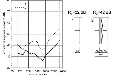 Závislosť vzduchovej nepriezvučnosti od hrúbky akusticky jednoduchej steny pri zachovaní rovnakej objemovej hmotnosti sa uvádza na obr. 2.