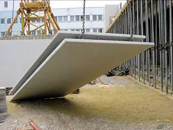 Pripravenosť na osadenie stienVýšková presnosť podkladovej dosky má byť ±1cm (podľa príslušnej normy). Už pri betonáži dosky (základovej alebo stropnej) je potrebné zabezpečiť presné osadenie stykovacej výstuže. Nesmie sa používať sieťovina – kolízia s priestorovými nosníkmi. Vzdialenosť stykovacej výstuže od kraja budúcej steny by mala byť ≥ 7 cm. Pred dodaním stien na stavenisko sa musí vyniesť pôdorys všetkých stien, dverí, priechodov a musí sa zamerať najvyšší bod podkladovej dosky, ktorý je pri osadení stien určujúci. Najvyšší určujúci bod (podlahová škára podľa výkresu s plánom kladenia) sa rovná hornej hrane podložiek. Treba počítať minimálne so štyrmi podložkami na každý diel (2 na vonkajší plášť, 2 na vnútorný plášť). Eventuálne možno pridať podložky vedľa otvorov. Kombináciou rôznych hrúbok podložiek vznikne priebežná rovina na osadenie dielcov.