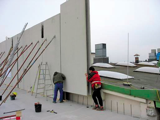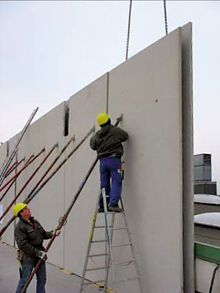 Následne sa filigránová stena osadí na predpripravené montážne podložky. Pritom treba dbať na dodržanie zvislej polohy dielca. Vertikálna škára medzi panelmi je približne 1 cm. Korektúra koncovej polohy steny sa realizuje páčidlom.