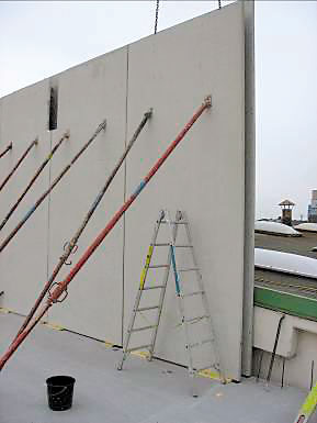 Po upevnení a zaistení obidvoch šikmých stojok sa môže stena zvesiť zo žeriavových hákov. Skoršie zvesenie z hákov nie je povolené.