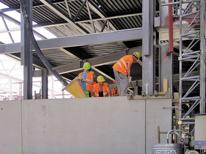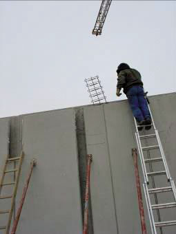 | Pozor! Stykovacia výstuž Stykovacie výstuže musia byť priame bez ochranných hákov, pretože ak sa zachytia do priestorových nosníkov, je ďalšia manipulácia so stenou (a tým aj korekcia jej uloženia) nemožná. S rozmiestnením stykovacej výstuže treba počítať už pri viazaní výstuže základovej/stropnej dosky. Stykovaciu výstuž sa odporúča osadiť tak, aby po uložení steny bola asi 7 cm od jej okraja. Bezpečnosť Betonáž |