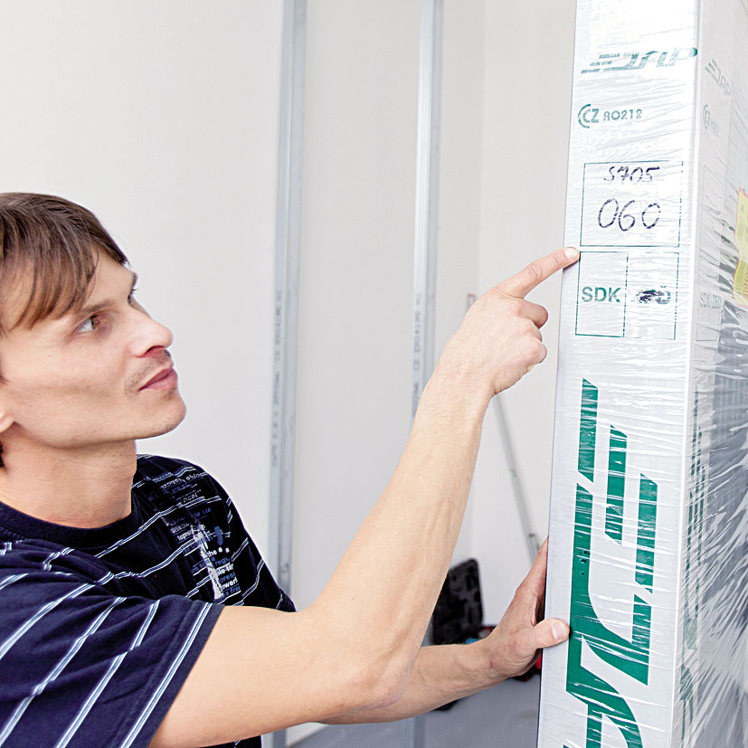 Zostavené stavebné puzdro sa zdvihne z horizontálnej polohy, v ktorej sa pre lepšiu manipuláciu zostavovalo, do vertikálnej polohy. V ďalšom kroku sa zameria poloha budúcej sadrokartónovej priečky a vyznačí sa na podlahe a na nadväzujúcich stenách i strope.