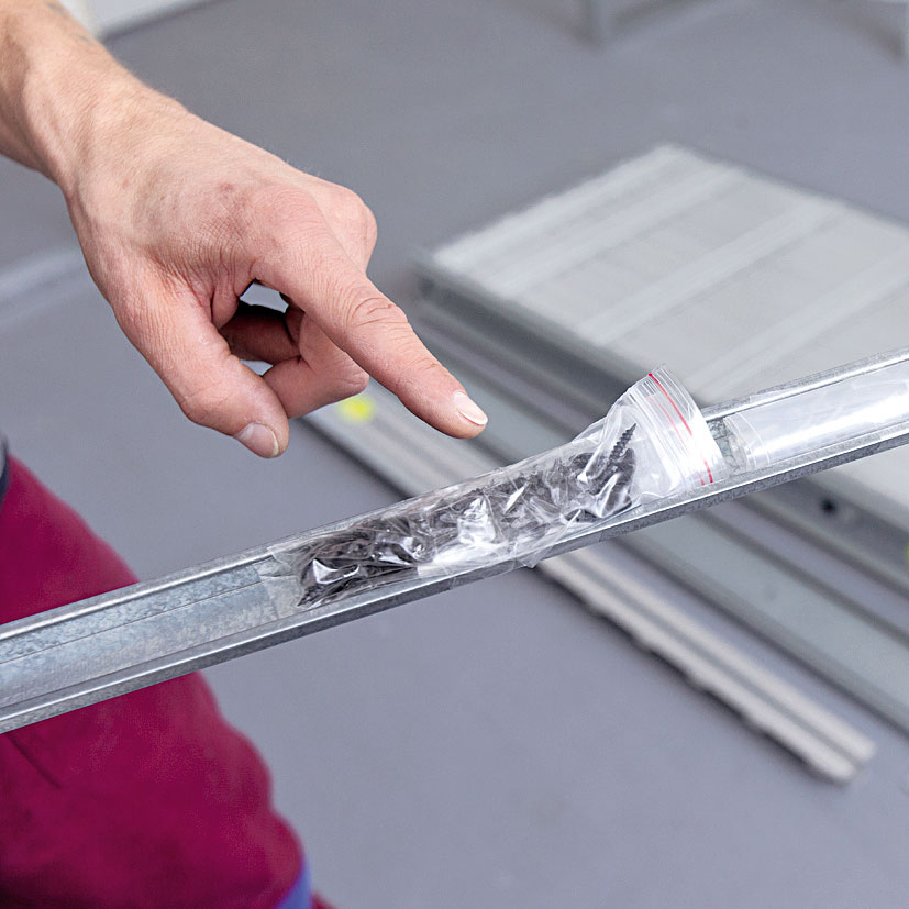 Následne treba skontrolovať úplnosť dodávky. V balení by sa mali nachádzať plechová kapsa, nadpražie s koľajnicou, plechová stojina, dve dištančné vzpery, montážny balíček.