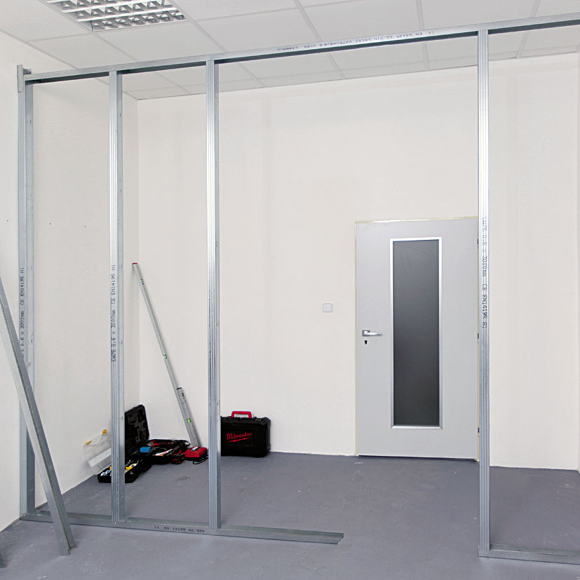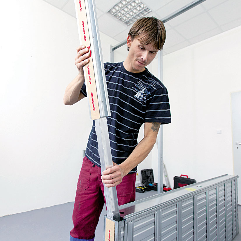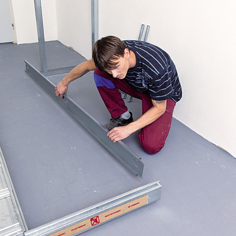 Do nadpražia sa zasunú jazýčky stojiny a potom sa zahnú tak, aby sa zaistili v polohe, keď medzi nadpražím a stojinou nie je žiadna medzera. Už ohnuté dištančné vzpery sa zasunú do výliskov v stojine a v montážnom kryte. V ďalšom kroku sa zameria poloha budúcej sadrokartónovej priečky a vyznačí sa na podlahe a na nadväzujúcich stenách. Osi stien sa prenesú pomocou vodováhy a rovnej laty na strop.