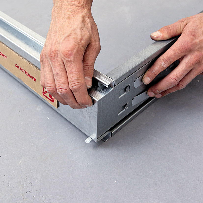 Zostavenie stavebného puzdra pozostáva z niekoľkých krokov. Puzdro sa vybalí z plastovej fólie a odstráni sa kartónová ochrana. Zostavená koľajnica s nadpražím sa vloží do hornej časti puzdra. Výlisky koľajnice sa zasunú do výliskov v stropnej lište a posunú sa do polohy, v ktorej záseky nadpražia zaskočia za lemy bočníc puzdra. Dištančné vzpery sa upravia ohnutím pätiek do pravého uhla podľa nákresu.