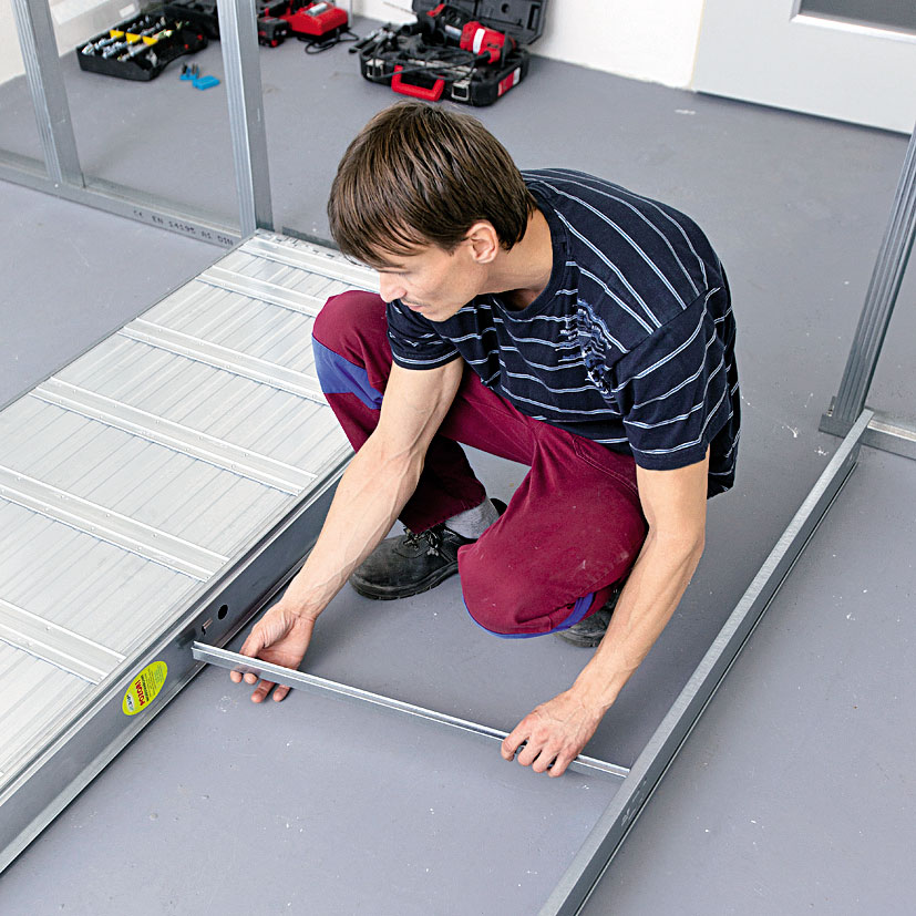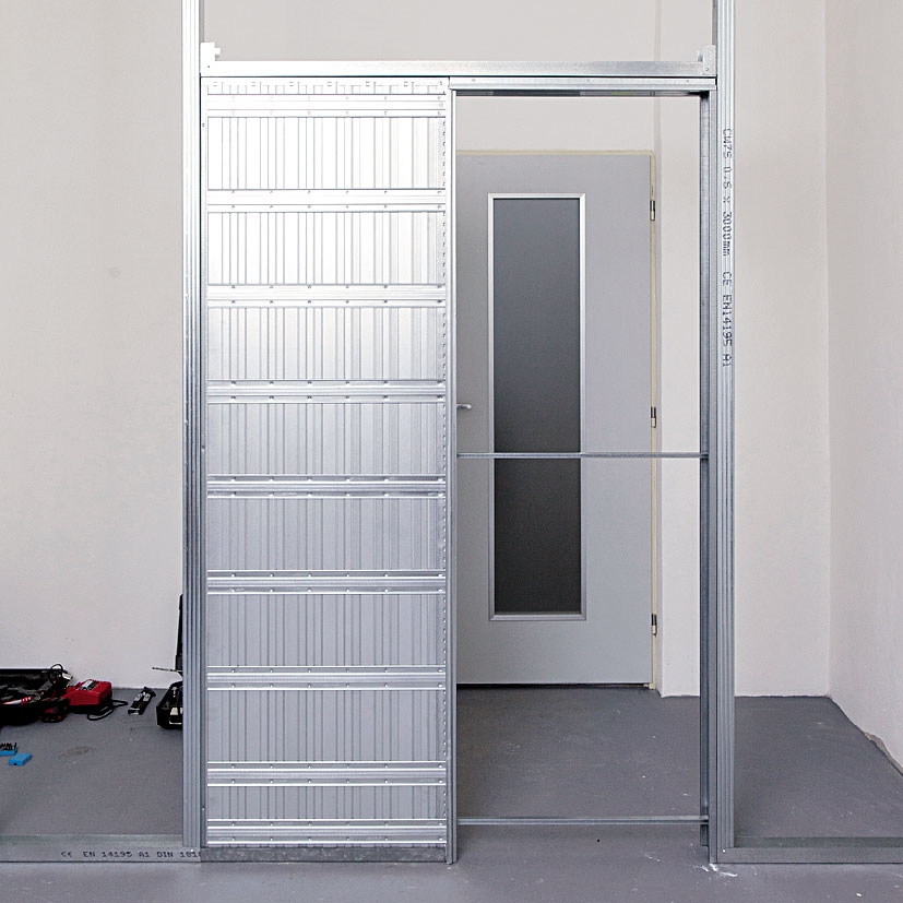 Potrebné profily sa nastrihajú nožnicami na plech. Tie profily, ktoré sa budú pripevňovať na podlahu, steny a strop, je potrebné z dôvodu tepelnej a zvukovej izolácie podlepiť samolepiacou páskou (Knauf) alebo napájacím tesnením (Rigips) v závislosti od zvoleného typu systému. Na dokončenú podlahu, steny a strop sa pomocou zatĺkacích plastových rozperiek vo vzájomnej vzdialenosti 800 mm pripevnia profily UW. V mieste budúceho priechodného dverného otvoru sa na podlahe tento profil vynechá (rozmery sú stanovené výrobcom – napr. pri šírke čistého otvoru 600 mm je šírka hrubého stavebného otvoru 1 355 mm a výška hrubého stavebného otvoru 2 026 mm). Do profilov UW sa vložia a pripevnia pomocou skrutiek do plechu alebo špeciálnych klieští priečkové profily CW (stojiny), ktoré budú pevne spojené so zadnou stenou plechového puzdra a plechovou stojinou puzdra. Umiestnia sa chrbtom k puzdru (k otvoru) – ich vzájomný svetlý pôdorysný rozstup zodpovedá šírke puzdra vrátane nadprahového pojazdového profilu.