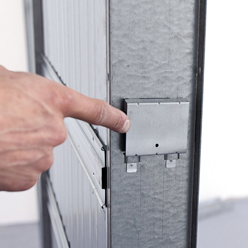 Do hornej časti plechového puzdra sa zasunie koľajnica s nadpražím. Tak bude koľajnica uchytená po celej dĺžke stavebného puzdra.