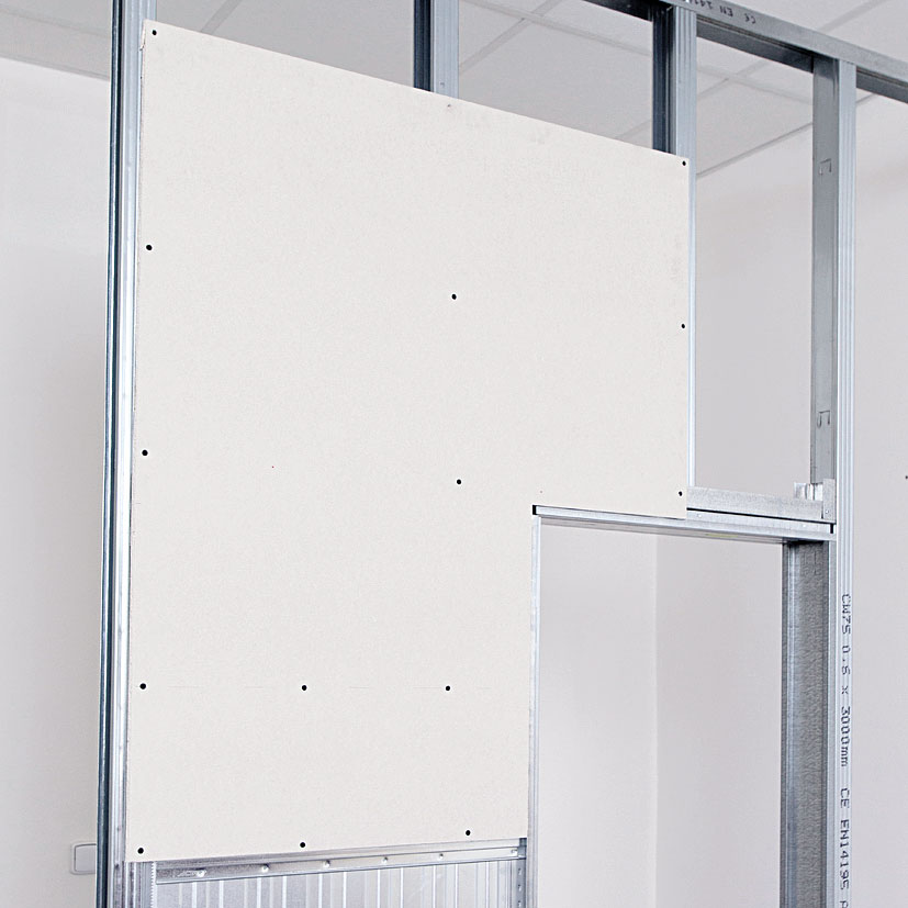Opláštenie sadrokartónom sa vykoná najskôr z jednej a následne z druhej strany puzdra. Prvá strana sadrokartónovej priečky sa oplášťuje celou sadrokartónovou doskou. Vertikálne škáry (v oblasti dverového puzdra) medzi sadrokartónovými doskami nesmú nikdy vybiehať z rohu dverového otvoru – musia sa nachádzať aspoň 150 mm od otvoru (byť tzv. predsadené), v jeho nadpraží (pravouhlý stranový výrez). Každý profil CW pritom nesie na sebe spoj dosiek vždy iba z jednej strany priečky. Sadrokartónové opláštenie sa zoskrutkuje s puzdrom tak, aby skrutky vytvárali vertikálne rady vzdialené od seba maximálne 600 mm (Rigips) alebo 625 mm (Knauf). Vzdialenosť jednotlivých skrutiek v rade je 250 mm. Následne sa vykoná opláštenie druhej strany steny, pričom sa začína polovičnou doskou. Tým sa dosiahne previazanie doskových spojov. Po dokončení sa škáry medzi doskami vyplnia škárovacím tmelom.