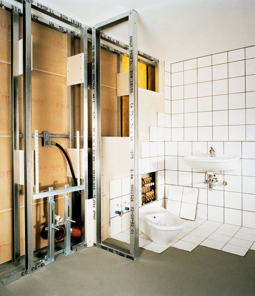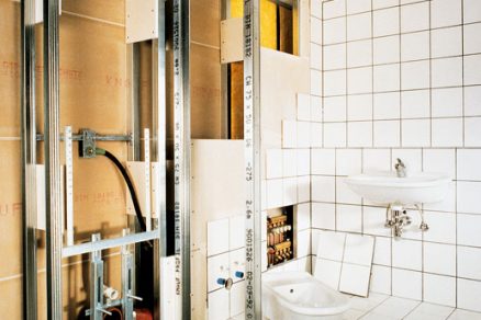 Inštalačná priečka so vsadeným nosičom na WC Kúpeľňa s nalepeným obkladom na sadrokartónové dosky