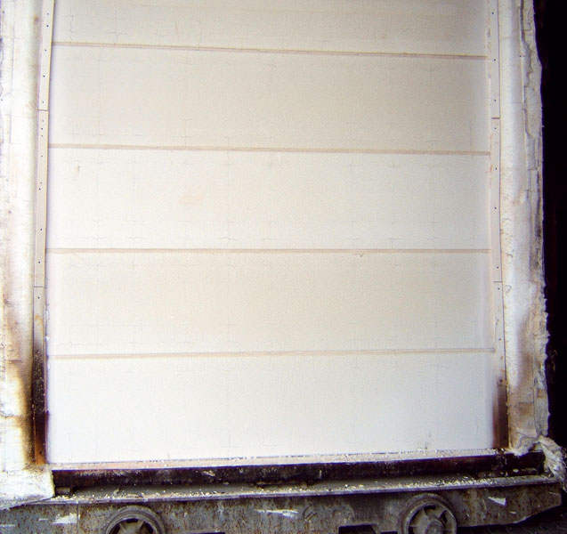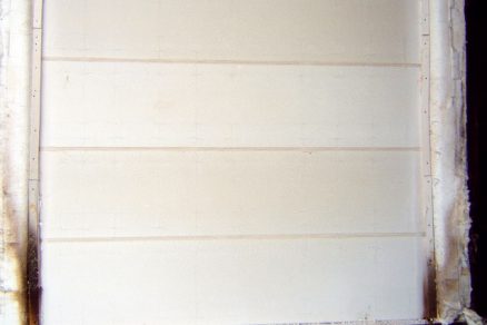 | Fotografie vzorky steny z vystužovaných dielcov hrúbky 150 mm po ukončení skúšky v 181. minúte. Vpravo neohrievaná strana vzorky, vľavo ohrievaná strana vzorky. | |