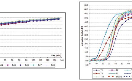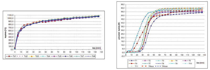 | Grafy nameraných teplôt na ohrievanej strane vzorky (a) a prírastkov teplôt na neohrievanej strane (b). Z grafov je viditeľné, že najväčší prírastok teploty je asi 60 °C pričom teploty na ohrievanej strane sa blížia k 1 100 °C. | |