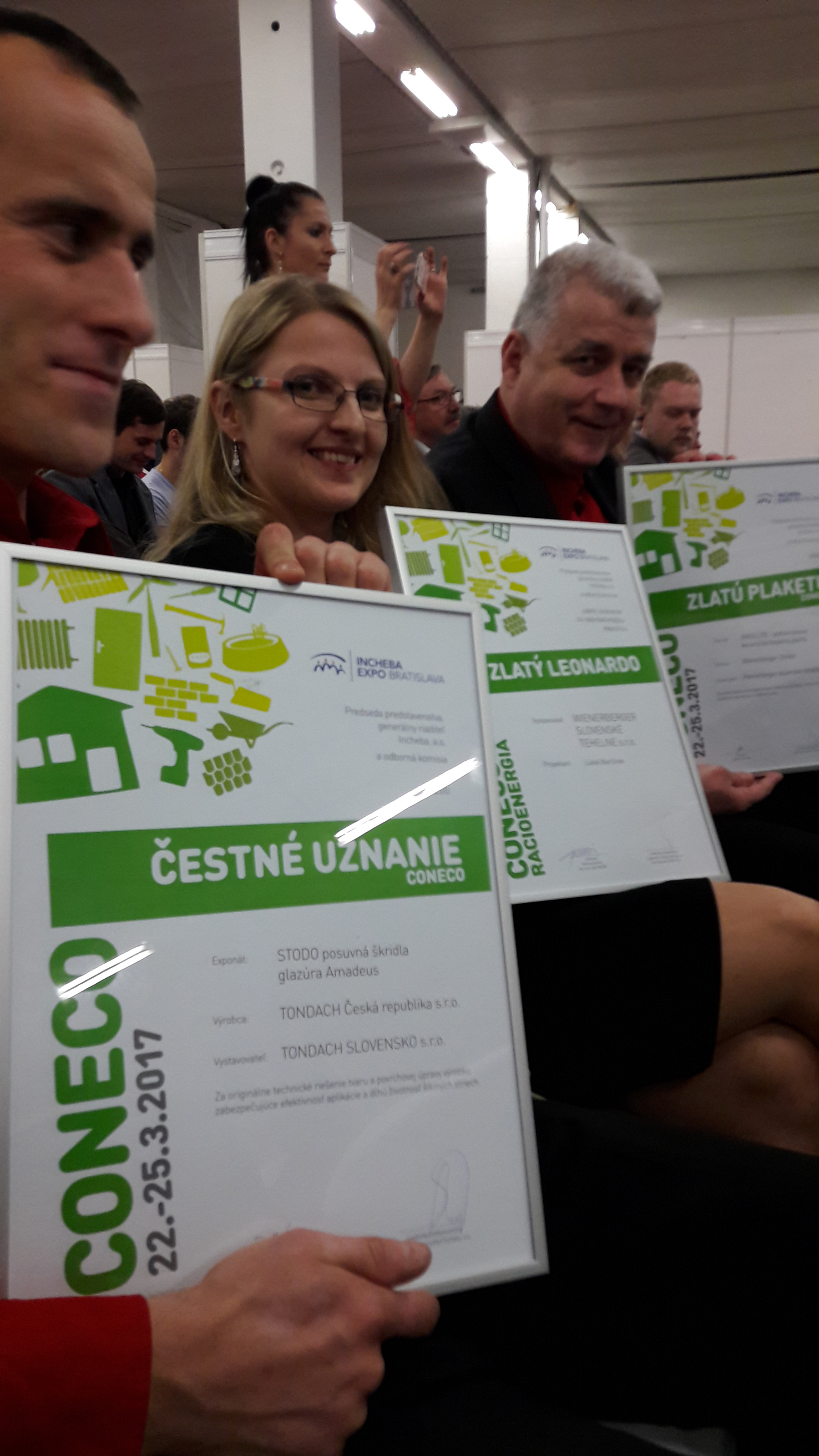 Čestné uznanie Coneco 2017, za originálne technické riešenie tvaru a povrchovej úpravy, získala posuvná škridla STODO – glazúra Amadeus, zabezpečujúca efektívnosť aplikácie a dlhú životnosť šikmých striech, spoločnosti Tondach Slovensko.